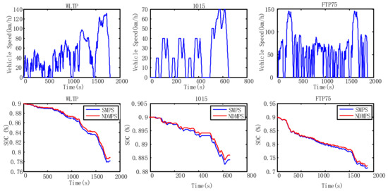 As shown in Figure 10 and Table 7, NDMPS has better economic performance than that of SMPS. In Figure 10, the battery SOC of NDMPS tends to drop slower than the SMPS. This is because the NDMPS have larger high system efficiency region than SMPS. Therefore, for giving vehicle speed and acceleration, the required power of battery for NDMPS is prone to be smaller. The mileages in the cruising condition and the different driving cycles (Table 7) show various degrees of improvement. Specifically, the mileage at 60 km/h cruising for NDMPS is 3.35% higher than that of SMPS and the maximum increment percentage for mileage among WLTP, 1015, and FTP75 (the EPA Federal Test Procedure) is 11.1%. This also indicates the potential energy-saving capability of NDMPS.