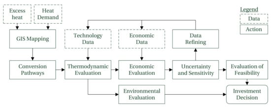 In the following, the method for evaluating the feasibility of excess heat (EH) utilization for the supply of different energy demands is shown. The overall method and setup of the tool is shown in Figure 1. Based on data for the excess heat and heat demand, a GIS mapping was performed, which was used to identify opportunities to recover EH. Based on the identified case, first a thermodynamic evaluation followed by an economic one was performed. For the model outcomes of these two evaluations, an uncertainty and sensitivity analysis was conducted. This allowed a targeted refinement of the key parameters, to increase the confidence in the model output. At the end, the results of the economic evaluation, including the uncertainties, together with an environmental assessment were used to evaluate the overall feasibility of the cases and make the investment decision. These results can then be used to make the decision if further investigations by, e.g., consultants should be made.