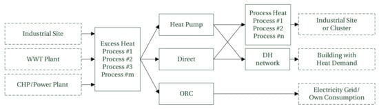 The utilization pathways for the use of excess heat, considered in this work, are shown in Figure 2. Three technologies were considered, namely direct heat transfer, heat pumping and organic Rankine cycles (ORC). The considered uses of the excess heat were: industrial sites requiring process heat, heat demand of buildings and the electrical grid.