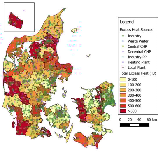 Map of Denmark with the location and type of excess heat sources and the total sum of excess heat of each region.