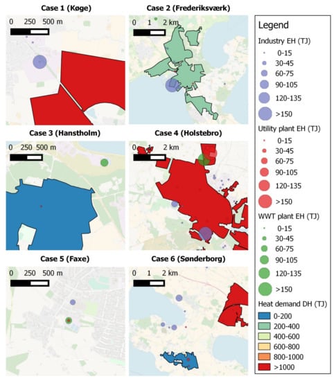 Examples of the identified case studies based on the overall mapping. The maps show excess heat sources as points with the radius of the points proportional to the annual excess heat. The locations of district heating areas are marked as polygons with the color representing the annual heating demand.