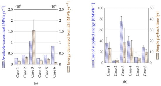 In Figure 5, the case studies are compared by showing the available and recovered energy (Figure 5a) and their unit costs, as well as simple payback time of the investment (Figure 5b). Most cases could not recover the entire assumed EH, which was due to a limited demand (Case 4) or due to remaining excess heat in the source ().