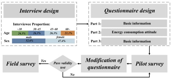 where ne is the number of reviewers identifying an item as “essential” and N is the total number of reviewers, which equals 4 in this paper. Then CVI can be calculated by averaging the CVRs of all items. According to previous studies [], if the CVI value exceeds 0.80, we consider it to be preferred or items in the questionnaire should be modified until the value reaches the decision threshold. After that the completed questionnaire was used in the field survey. The procedures of the study design are shown in Figure 2.
