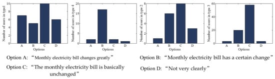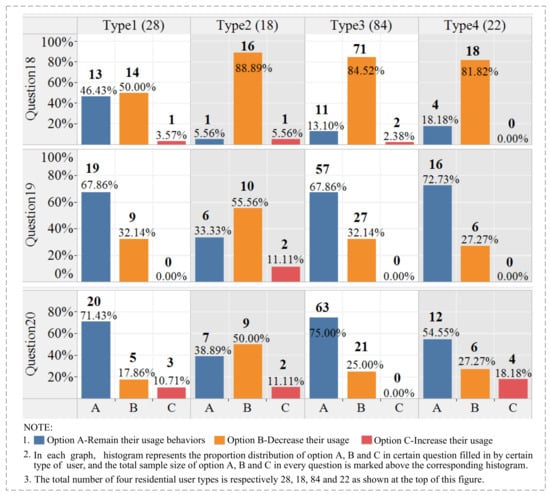 As mentioned in Section 2.1.2, questions 18–20 are respectively designed to ask interviewees about how they will adjust their ELCBs when their electricity usage is higher than (YEU > AEU), equal to (YEU = AEU) or below (YEU < AEU) the average electricity consumption and question 21 is used to classify interviewees into four groups. According to the survey data collected by questions 18–21, this subsection begins with statistical analysis to study the behavioral change direction of different residential user types under the interference of normative comparison feedback, which is clearly presented in Figure 3.