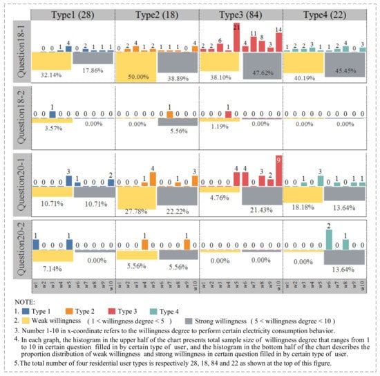 This subsection begins with the statistical analysis of survey data collected by Question 18-1, 18-2, 20-1 and 20-2, exploring the difference of willingness degree among various residential user types to implement certain ELCB under different scenarios. The above four questions refer to four different ELCBs in turn, that is saving electricity when “YEU > AEU”, using more electricity when “YEU > AEU”, saving electricity when “YEU < AEU”, using more electricity when “YEU < AEU”. Figure 4 with “4 (row) × 4 (column)” subplots gives a detailed summarize of related survey information.