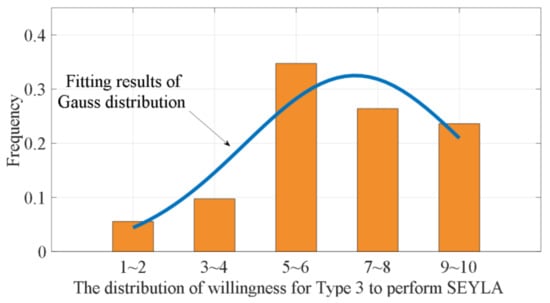 The distribution of willingness in various scenarios can reflect the characteristics of different type users, which is able to quantify the user’s behaviors, providing support for the establishment of residential ELCB response models. To determine the distribution that best fits the collected data, a curve-fitting process is performed. In this paper, the willingness of Type 3 for saving energy when “YEU > AEU” (SEYLA) is taken for an example. Figure 5 shows the frequency of willingness for Type 3 to perform SEYLA in over five bins (i.e., 1~2, 3~4, 5~6, 7~8, 9~10.). Then it overlays the curve that resulted in the fit. For the case, Gaussian demonstrates the best performance with a considerable goodness-of-fit (R2 = 0.8221, adjusted R2 = 0.8221). The expression of the fit model is described by following Equation (2):