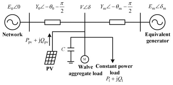 As shown in Figure 2, a large-scale PV power plant is integrated into a classic three-node system [5]. The three-node system is a classic model for studying voltage stability problems [28,29] and any complex system can be reduced to the form of a three-node system via equivalent transformation. Considering that most of the loads in power grids are induction motors, the load in Figure 2 is made up of the induction motor (Walve aggregate load model [28,29]) and the constant power load in parallel. As shown in Figure 2, C represents the shunt capacitor banks. The purpose of installing capacitor banks is to ensure that the load bus voltage amplitude is in a qualified range when the three-node system is running.