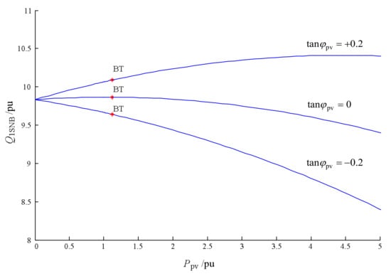 The range of the tanϕpv is generally from −0.2 to + 0.2 [9]. It can be seen from Equation (6) that the SNB point position difference between Ppvmax and Ppvmin is relatively large when tanϕpv ≠ 0. When tanϕpv = 0, the PV power plant runs in a unity power factor (cosϕpv = 1) and the SNB point position difference will decrease significantly.