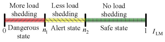 The load margin index ILM is calculated at the SNB point when Ppv = 0 pu. We set ILM ≥ n1~n2 (0 < n1 < n2 < 1) when the system is running normally. For example, if a system requires a load margin of 15% to 20%, then n1 = 0.15 and n2 = 0.2. As shown in Figure 4, the principle of load shedding according to the load margin index can be specified. When ILM < n1, the voltage stability of the system is in a dangerous state and the load should be shed more. When n1 ≤ ILM < n2, the voltage stability of the system is in an alert state and the load should be shed less. When ILM ≥ n2, the voltage stability of the system is in a stable state and the load does not need to be shed.