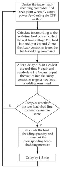 The process of fuzzy load shedding is shown in Figure 7. In this flowchart, after 5–10 s, the real-time operating data will be collected again and whether the two load-shedding commands are the same will be determined. The aim is to prevent the rapid change and recovery of the load power or PV output from causing the malfunction of the fuzzy controller.