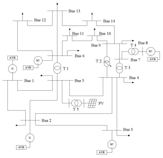 The IEEE 14-bus system with a large-scale PV power plant is used to further verify the control effect of the designed fuzzy load-shedding controller. As shown in Figure 8, a large PV power plant (installation capacity is 1 pu) is integrated into Bus 5 with a unity power factor. The power supplies installed in Bus 3, Bus 6, and Bus 8 are all synchronous compensators (SCs), and all synchronous generators and SCs have automatic voltage regulators (AVRs) installed within them. The initial total load power of the system is 2.59 + j0.814 pu.