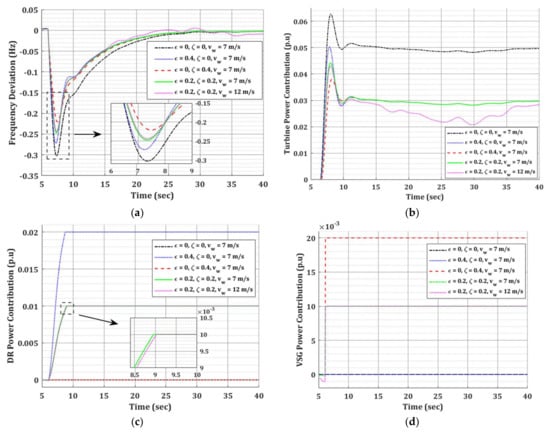 The change in turbine and DR powers are shown in Figure 5b–d where the steady-state values conform to Equations (27)–(29). The value of DR control share is fixed in this study (i.e., ε = 30%) and hence and