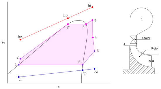 Notation used to describe the thermodynamic cycle (left) and a radial turbine (right). In the left figure the red and blue lines correspond to the heat source and heat sink temperature profiles respectively, and the magenta lines represent the thermodynamic cycle.