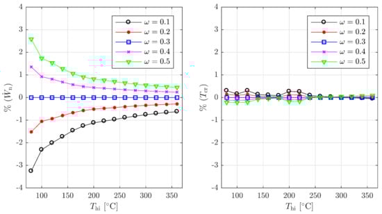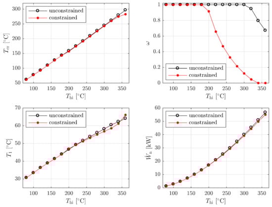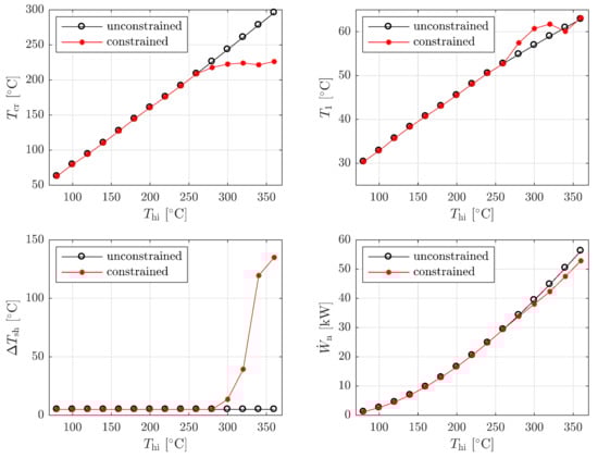The results for the constrained cases show a transition from to as increases. At low heat-source temperatures, the optimal constrained cycle is the same as the unconstrained cycle with . However, as increases, eventually results in a sub-atmospheric condensation pressure. Therefore, it is necessary to reduce to reduce the ORC pressure ratio, and ensure that . This continues as increases further, until is reached. After which, the condensation pressure constraint can only be satisfied by increasing , as observed in the bottom-left plot in Figure 3. The result of this sudden increase in is a reduction in the optimal , and a reduction in the power output; at , the constrained cycle generates 52.3 kW, compared to 56.2 kW by the unconstrained cycle, corresponding to a 6.9% reduction.