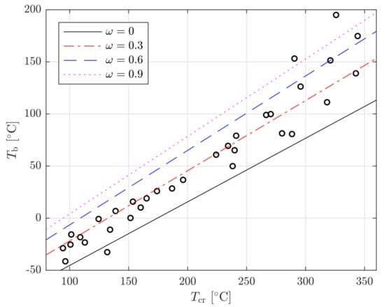 Critical temperature and boiling temperature of common working fluids available within the REFPROP program (circles) and the same parameters obtained using the Peng–Robinson equation of state for different values of with (lines).