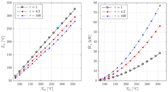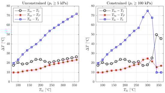 For the first study, the optimisation of the fluid and thermodynamic cycle was conducted for a range of heat-source temperatures according to the bounds given in Table 2. For each heat-source temperature, the optimisation was completed twice; once for an unconstrained condensation pressure (), and once for a constrained condensation pressure (). It is found that the working fluid is optimised such that and , which reaffirms observations previously made within the literature [20]. The temperature difference converges to the minimum value that results in a heat-transfer process that does not violate the minimum evaporator pinch point constraint at any point, and the location of this pinch point will be discussed later on. It is also found that the optimal solutions are insensitive to . The remaining optimisation variables are , , and , and these are plotted in Figure 3, along with the power output from the ORC system.