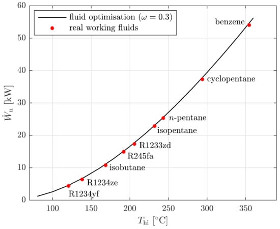 Within the cycle model, there is no consideration of the heat-exchanger area requirements. This is because prediction methods for the thermal conductivity, viscosity and surface tensions are required to be able to accurately size the heat exchangers. However, these cannot be calculated using the Peng–Robinson equation or state, and cannot be easily determined without either predefining the working fluid, or using relatively complex group-contribution methods, which, in turn, require the full molecular structure of the working fluid to be defined. This introduces significant complexity to the model, as demonstrated in Ref. [20] in which a relatively complex set of empirical equations are implemented to determine these properties for only hydrocarbon fluids. Moreover, requiring the molecular structure to be defined, does, by definition, lead to a less general approach. For this reason, the authors have chosen to focus on thermodynamic performance only. However, it is noted that component sizing and costing remains an important aspect of system modelling, and an optimisation on the basis of thermo-economic performance indicators, such as the payback period, could result in different optimal systems. Therefore, once the suitability of the method described within this paper has been confirmed, thermo-economic optimisation should become an objective of future studies.