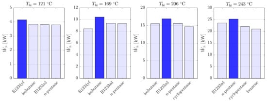 - Schwoebel, J.A.H.; Preißinger, M.; Brüggemann, D.; Klamt, A. High-throughput screening of working fluids for the organic Rankine cycle (ORC) based on conductor-like screening model for realistic solvation (COSMO-RS) and thermodynamic process simulations. Ind. Eng. Chem. Res. 2017, 56, 788–798. [Google Scholar] [CrossRef]