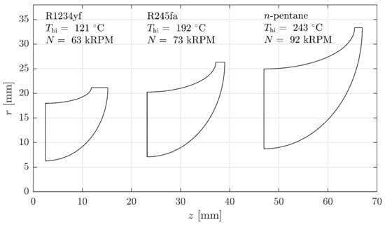 Loss models exist to assess the performance of radial turbines [39,40]. However, most of these models are empirically based and have been developed for radial turbines operating with ideal gases. Therefore, there are uncertainties surrounding the application of these models to ORC turbines. However, in the absence of experimental data for validation, a number of authors have successfully applied these models to ORC turbines [30,32]. Therefore, it seems reasonable to apply these models to ORC turbines, but it is stressed that future experimental validation is a necessity.
