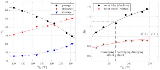 Loss models decompose the total drop in efficiency of the rotor into a number of different loss mechanisms. One widely implemented set of loss models is reported by Baines [39], in which losses are decomposed into incidence, passage, clearance, trailing edge and windage losses. The incidence loss accounts for recirculation behind the rotor leading edge at off-design conditions, and can be neglected for design-point calculations assuming that the rotor will be adequately designed to ensure there is no recirculation at the design point. The passage and clearance losses, denoted and respectively, are expressed as a reduction in the kinetic energy of the flow, corresponding to an increase in the static enthalpy at the rotor exit: