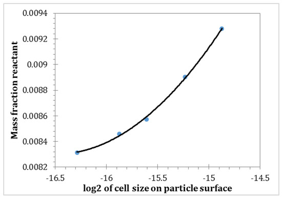 The mesh independence study is completed at an exothermic reaction (dHrxn = −10 kJ/mol) because the external heat transfer becomes the controlling phenomenon in this case and therefore the grid size becomes important. The mass fraction of specie A (xA) at 2 planes (Section 2.3.2) below the outlet is analysed to explore the mass fraction of xA through the geometry on different grid sizes. Figure 1 shows that the overall conversion decreases with each doubling of the grid size when fitted with an exponential function. This is because larger cell sizes overpredict the external heat transfer, allowing more of the heat generated by the exothermic reaction to leave the particle, in turn resulting in a cooler particle and a lower reaction rate. The difference between the value at dp/60 and the infinitesimally small cell size results in the difference of 4.8%. Thus the cell size of dp/60 on particle surfaces is used in this work. Subsequently, the growth rate of 20% is followed to fill the voids for fluid and solid sections.