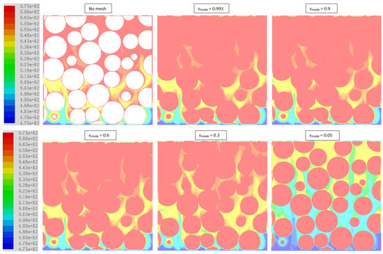 The contour plots for fluid temperature (K) (at plane y = 0, through a bed of ε = 0.351, Re = 100, Pr = 1). (Top left: (No mesh) represents the case without inside particle mesh [19]; in all other plots εinside represents the particle porosity in each case). The edge of low temperature at the inlet and outlet is because of the added volume region to avoid meshing problems; this does not affect the overall Nusselt number obtained.