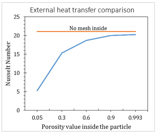 Nusselt number extracted on 25 planes based on local driving force [18,21,42,43] versus porosity value inside the particle. The comparison is made to Nusselt number from the ideal external heat transfer case without inside particle mesh. This value has also been verified with Singhal [19] heat transfer correlation.