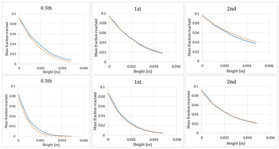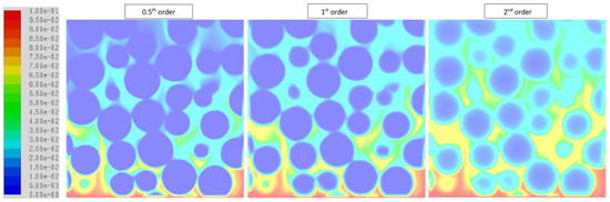 In order to have uniformity in the predictions of reactant concentration (xA) with different reaction orders, the temperature influence (i.e., no heat transfer limitations) on reaction rate in this validation is eliminated. First, the effective diffusivity (De) of the gas inside the particle is calculated for the first-order reaction with reaction rate constant of 10,000 1/s (for = 10 and = 5) using Equation (3). Here, we assume that to account for a realistic particle porosity and tortuosity. Following this, using the rearranged Equation (3) for a fixed inlet concentration (cA = 10 mol/m3), the reaction rate constant (k; Equations (18) and (3)) for each reaction order is calculated in Equation (17). This practice ensures that the ratio of reaction rate to diffusion rate at the start of the geometry is identical between cases with different reaction orders.