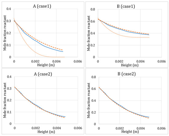 Comparison of the mole fraction of reactant (of specie A and specie B) for the simulated two cases, (Top) Case 1, and (Bottom) Case 2 from (i) PR-DNS (represented by solid lines); (ii) 1D model corrected (dashed lines); along the height of the reactor geometry. The dotted lines in Case 1 (Top) represent the predictions without adjusting the effectiveness factor as .