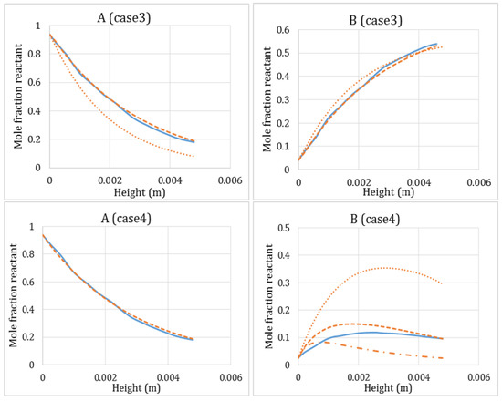 For Cases 3 and 4, the inlet reactant mole fraction yA is set to 1. The reaction rate expressions simulated in these two cases are shown in Equations (22) and (23).