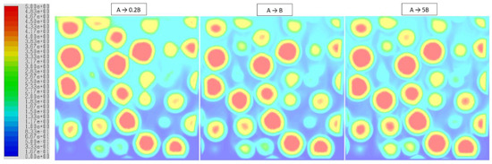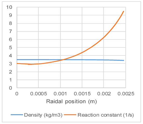 In order to simplify the comparison between Cases 1 and 2, the inlet reactant ratio (of A and B i.e., yA:B = 1:2) is kept the same, and simulated for = 10, with flow properties for all the reacting species [(Case 1 (Equation (19)) and Case 2 (Equation (20))] similar and given in Table 2. The reaction rate constant (k2) for Case 2 (Equation (20)) is offset to 1000 1/s. The reaction rate constant (k1) for Case 1 is defined based on the fixed reaction rate constant of Case 2 (Equation (21)), by assuming the overall reaction rate from both cases to be equal at the reactor inlet.