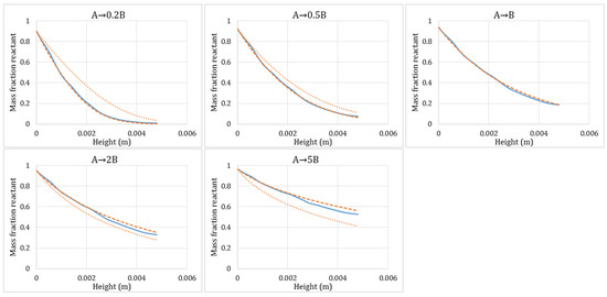 Comparison of mass fraction of the reactant (specie A) along the height of the reactor between PR-DNS (solid lines), modified 1D model (dashed lines), and 1D model (dotted lines) for different reaction cases in Table 3. The dotted lines represent the 1D model predictions without accounting for gas volume generation. The inlet specie concentration in the case of the 1D model has been adjusted to account for faster specie conversion at the inlet in PR-DNS results.