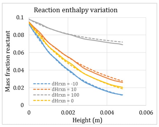 In the previous sections, only the effect of mass transfer was considered. Therefore, in this section, the combined effect of heat and mass transfer limitations is presented. The first-order reaction (Section 3.1) is simulated for the case at Thiele modulus ( = 10) and Prandtl number (Pr = 1) with properties given in Table 1. The effect of reaction enthalpies or heat of reaction on specie conversion is detailed using two different endothermic (with dHrxn = 10 and 100 kJ/mol), one exothermic reaction (dHrxn = −10 kJ/mol), and an isothermal case with (dHrxn = 0 kJ/mol).