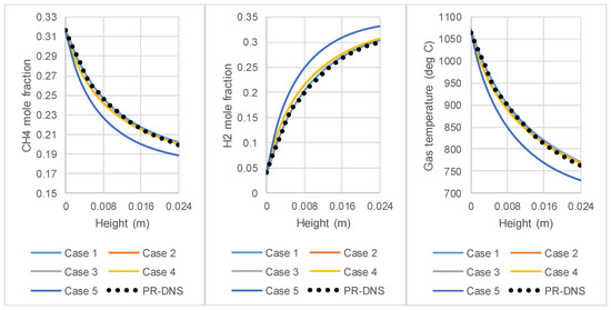 As outlined in Section 2.2, the 1D model is also based on the Eulerian multifluid approach. Only in this case, the void fraction is constant in all cells and the geometry is meshed only in one direction. More details can be found in the previous work of the authors [44] and the applications in subsequent studies [32,33]. The domain is discretized into 100 cells with the length of the geometry equal to the PR-DNS geometry as given in Table 1. The 1D model is solved with similar simulation setup and boundary condition of respective PR-DNS cases. The primary difference is that the particles are assumed to have a realistic void fraction of 0.3 (as opposed to εinside = 0.993 used in the PR-DNS as outlined in the previous section), so no adjustment to the reaction rate is required.