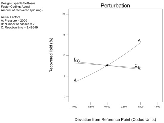 Figure 1 represents a perturbation plot that shows the interaction between the three process parameters on the amount of lipid concentration produced. From the plot, the amount lipid concentration produced is because of an increase in homogenization pressure on % of lipid recovered. This indicates that, as the homogenizing pressure increases, the % of lipid yield increases; while (b); number of passes show a slightly significant increase in the amount of lipid recovered; (c) Reaction time seem to behave the same way with number passes on the lipid concentration produced. Thus, from the perturbation plot, increase in pressure will constantly improve the amount of lipid produced.