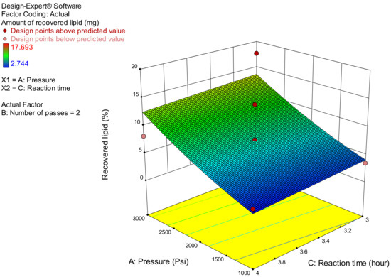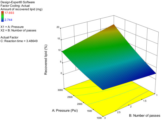 Figure 3 and Figure 4 demonstrate the three-dimensional (3D) plots of the outcome of pressure on % recovered lipid yield. In Figure 3, at a fixed number of passes 2, and considering a homogenization pressure of 3000 psi and 1000 psi and a reaction time 4 h. The % of lipid recovered decreases from 15% to 3%. The final % of lipid that is recovered at this point is 80% at 4 h extraction time. This result confirms that increasing the pressure and the reducing the number of passes does not have any significant effect on lipid extraction efficiency. This may be attributed to the inability of the microalga cell well not completely disrupted during the pre-treatment process to improve lipid extraction efficiency. At a constant homogenization pressure of 3000 psi and considering a reaction time of 3 and 4 h, the percentage of lipid recovered decreases from 15% to 13%, respectively. The final percentage of lipid yield is 13%. The results confirm that at a pressure of 3000 psi and 3 h reaction time the final percentage increases to 15%, while at 4 h extraction time, the lipid yield decreases. This simply proves that at a low reaction time and high pressure the lipid yield efficiency increases, while at higher reaction time and pressure the yield of lipid decreases. In summary, Figure 3, under a high-pressure condition of 3000 psi and number of passes of 3, satisfy the agreement that a pressure increase results in high yield of lipid produced.