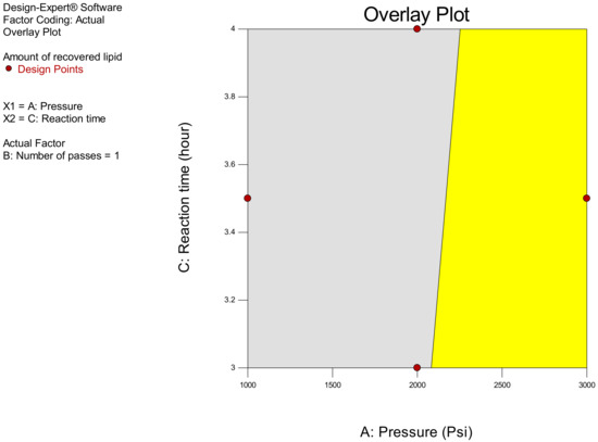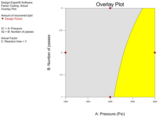 From the response surface mathematical model, as indicated in Equation (1), that defines the significant effects of input variables on the output responses (% of lipid recovered), a study on optimization were performed using Design Expert Software V10. While the basic reason for conducting the optimization is to combine the productivity and cost of the entire process. The percentage of lipid produced was maximized with level 5, and the number of passes was maximized at level 5, the homogenizing pressure varies in the ranges specified in Table 1. The optimal recovered lipid yield of 16.55 from the numerical optimization was achieved at a number of passes = 1, pressure = 3000 psi, and reaction time = 3 h. The graphical optimization plots (Figure 5 and Figure 6) clearly shows the optimal input responses (optimal parameters by means visual observation. The yellow region in the graphical optimization plot indicates that the ideal values certify that the calculated standard as indicated in the curve agrees with the standard of optimization criteria. The plots clearly established that the optimum conditions for a maximized % of recovered lipids are at a pressure of 3000 psi, the number of passes = 1, and reaction time of 3 h of high-pressure homogenizer pre-treatment.