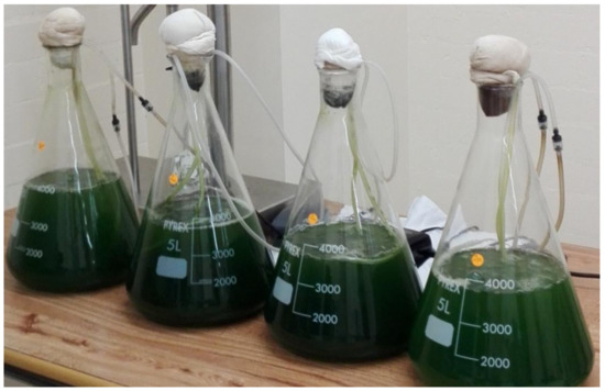 Four conical flasks of five-liter sizes were thoroughly washed and allowed to dry at room temperature by placing them inversely on the laboratory rack as shown in Figure 7. The dried flask was then sterilized at 60 °C for 4 h, and then allowed to cool before using. Exactly four liters of distilled water H2O was poured in each sterilized flask following the inoculation of 0.4 g of the microalga into the flask, which 1.5 g of K10 (Unicellular algae medium) (chemical composition includes; Sodium nitrate, Magnesium sulphate, Dipotassium hydrogen orthophosphate, Calcium chloride, Ammonium chloride and Trace elements with weight (%) of 62, 16, 15, 4, 3, and <1, respectively) were added to each flask. After the additions, the flasks were vigorously shaken to ensure proper circulation of the nutrients inside the flasks. The pumps that supply air (CO2) were then directly connected maintained for an effective growth. A 24-h white fluorescent light intensity of 75 lumens was maintained during the culture period. At 6 h interval, each of the flasks was jiggled (hand shake manually) to avoid the settling of the nutrients at the bottom of the flask. The microalga sample were cultured for a period of 14 days (two weeks).
