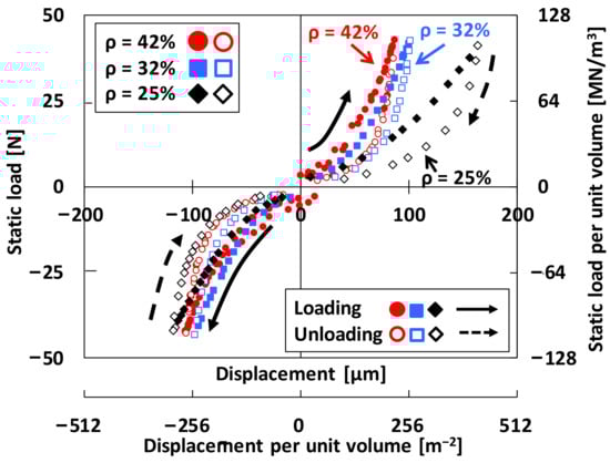 Full hysteresis loop measurements: Applied static load (left vertical axis) and static load per unit volume (right vertical axis) versus recorded displacement (upper horizontal axis) and displacement per unit volume (lower horizontal axis) for the test WMDs during loading and unloading cycles. The circle, square, and diamond symbols denote the structural stiffnesses of the WMDs with 42%, 32%, and 25% densities, respectively.