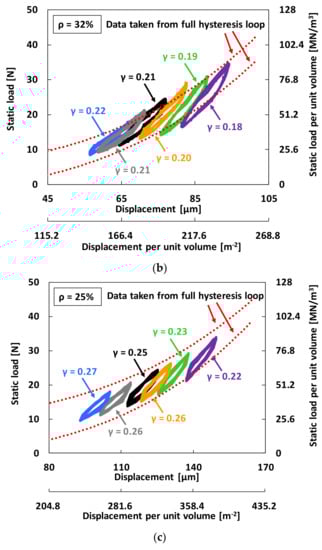 Local hysteresis loop measurements: Static load FS (left vertical axis) and static load FS per unit volume (right vertical axis) versus displacement (upper horizontal axis) and versus displacement per unit volume of WMD (lower horizontal axis). (a) WMD of 42% density; (b) WMD of 32% density; (c) WMD of 25% density.