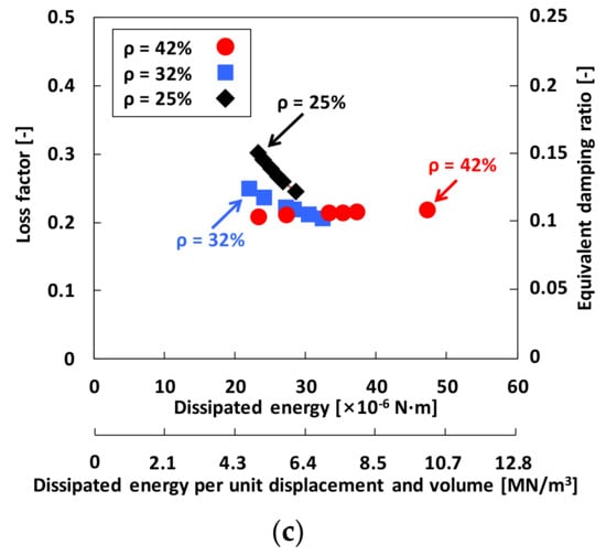 Reliable loss factors are a must to ensure the acceptable performance of WMDs. Figure 12 depicts the estimated WMD structural loss factor γ versus (a) preload FPre (upper horizontal axis) and preload FPre per unit volume of the WMD (lower horizontal axis), (b) local stiffness KLocal (upper horizontal axis) and local stiffness KLocal per unit volume of the WMD (lower horizontal axis), and (c) dissipated energy Edis (upper horizontal axis) and dissipated energy Edis per unit displacement and volume of the WMD (lower horizontal axis). In the figures, the right vertical axis displays identified equivalent damping ratio (ζeq = ~50% of loss factor, recall Section 3.2). Note that the current estimation uses the local (average) stiffness coefficients (KLocal in Figure 9) from the small local hysteresis loops as structural stiffness coefficients with the constant WMD displacement amplitude of ~12 μm. The identified loss factors range from 0.21 to 0.30. The results show the paramount effect of density of the WMDs on decreasing structural loss factor, in particular when the applied preload is relatively small. For ρ = 25% and 32%, the loss factor decreases gradually with preload. For example, γ ~ 0.30 → 0.24 for the WMD with ρ = 25% and γ ~ 0.25 → 0.21 for the WMD with ρ = 32%. On the other hand, for the WMD with ρ = 42%, the loss factors remain nearly invariant while increasing preload on the test WMD. That is, the loss factor is not sensitive to the applied preload when the WMD density is relatively large. Interestingly, from Figure 12b, the identified loss factors of three test WMDs become very similar, i.e., γ → 0.21 when KLocal > ~1.1 MN/m (or KLocal per unit volume of the WMD > ~2.8 × 1012 N/m4) for all test WMDs. For completeness, Figure 12b,c relate the identified loss factors with the WMD local stiffness and the dissipated energy. Note that loss factors of WMDs can only be determined experimentally [].