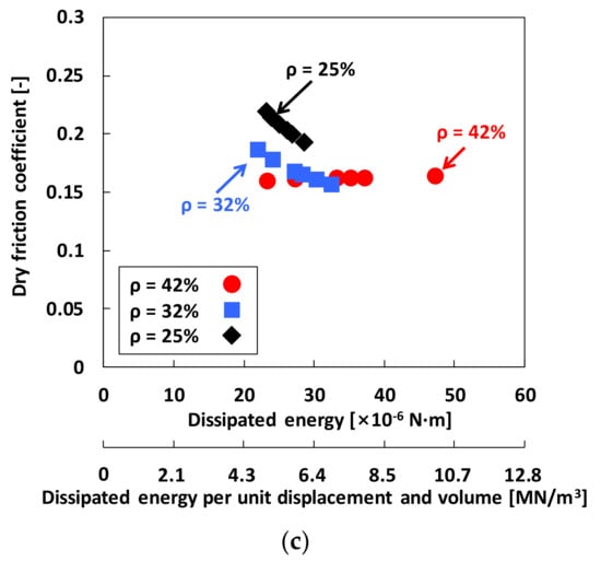 Figure 13 depicts estimated dry friction coefficients μf versus (a) preload FPre (upper horizontal axis) and preload FPre per unit volume of the WMD (lower horizontal axis); (b) local stiffness KLocal (upper horizontal axis) and local stiffness KLocal per unit volume of the WMD (lower horizontal axis); and (c) dissipated energy Edis (upper horizontal axis) and dissipated energy Edis per unit displacement and volume of the WMD (lower horizontal axis). The dry friction coefficients of three test WMDs range from 0.16 to 0.22. For the WMD with ρ = 42%, μf is nearly invariant over the entire preload ranges. On the other hand, for the WMDs with ρ = 32% and ρ = 25%, the dry friction coefficients steadily decrease from 0.19 to 0.15 and from 0.22 to 0.19, respectively, when the preload increases from 13 N to 23 N. Note that structural loss factors γ = 0.2–0.3 estimated are derived from static load tests. It is expected that, when dynamic loads with high excitation frequency are applied, loss factors are lower than the currently identified values due to a kinetic dry-friction coefficient. Figure 13b,c provide more complete knowledge relating the estimated dry friction coefficient with the WMD local stiffness and dissipated energy in the test dampers.