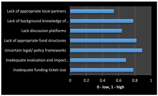 Manetsgruber et al. [34] undertook a stakeholder consultation to identify the risks to mini-grids. Figure 1 shows the main barriers identified by the study. Weak enabling environment (regulatory and policy frameworks) emerges as the main challenge, followed closely by lack of appropriate fund structure, inadequate funding ticket size and lack of background knowledge of financiers.