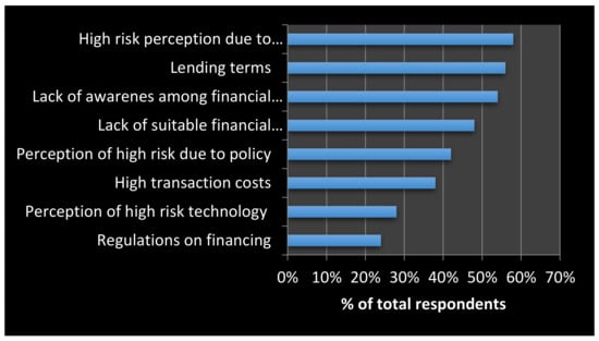 IRENA [44] reported the stakeholder perception about the main reasons behind the financial challenge (See Figure 3). The high-risk perception about the sector is the main barrier. The lending term comes next, which is followed by the general lack of understanding of the financial institutions about the sector.