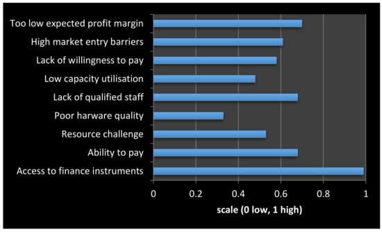 Regarding barriers to scaling-up of mini-grids, Manetsgruber et al. [34] indicated that lack of access to finance is the main challenge (Figure 4). Low profit margin, limited ability to pay and lack of qualified staff emerge as other main barriers.