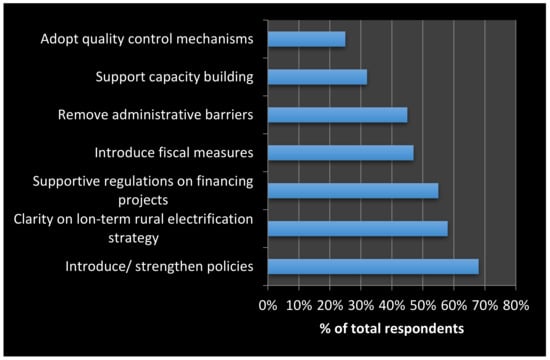 Various studies have provided lessons from their analysis and offered suggestions for interventions. These recommendations range from generic policy and support advices to specific issues such financial or technical or regulatory interventions. Irena [44] reports the preferred actions for government intervention in the sector (see Figure 5). It indicates that off-grid policy strengthening and long-term rural electrification strategy appear as the most important areas. Supporting regulations on financing and supportive fiscal measures are the other two important factors identified by them. Capacity building and removal of administrative barriers received relatively lower support while stringent quality control measures received the least support.