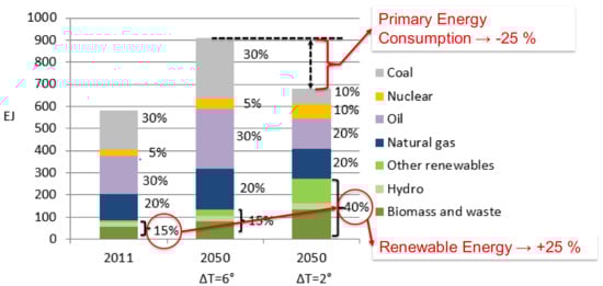 In recent decades, the world energy consumption has continuously increased, especially because of the strong economic growth of non-OECD (Organisation for Economic Co-operation and Development) countries [1,2]. Fossil fuels have mostly been used to cope with this increased energy demand, leading to considerable concerns about climate change. Therefore, an increasing use of renewable energy sources and a more efficient exploitation of primary energy sources are indispensable to reduce carbon dioxide emissions and limit global warming effects, as suggested by the chart in Figure 1 [3]. In this figure, the first column represents the world’s total primary energy supply in 2011. The second bar represents the outlook of the primary energy supply at 2050 in the current energy scenario, for which the average global temperature rise is projected to be 6 °C. The third column represents the outlook at 2050 in the 450 Scenario, for which the average global temperature increase should be limited to 2 °C. The figure highlights how the share of renewable energy sources should reach about 40%, while the primary energy consumption should decrease about 25% compared to the 6 °C Scenario (i.e., the energy efficiency should increase by about 25%) to limit the average temperature rise.