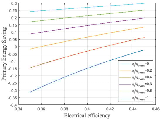 Primary energy saving (PES) as function of the combined heat and power (CHP) plant’s electrical efficiency for different ratios of the nominal thermal power actually exploited (the chart is representative of CHP plants adopting a reciprocating internal combustion engine).