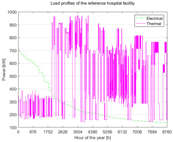 Annual duration curve of the electrical load and contemporary thermal load profiles of the analyzed hospital facility.