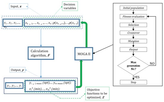 The authors developed a specific evaluation algorithm. This algorithm, which will be described in detail in the evaluation algorithm, was coded and coupled to the genetic algorithm MOGA II, according to the logic scheme shown in Figure 4.